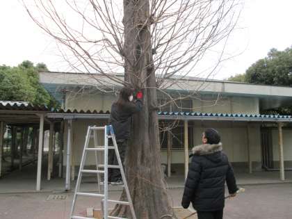 中庭で集会をする関係で、管理作業員さんに枝の剪定を行っていただきました。安全面を考え、教頭先生と二人組で作業を行ってもらいました。