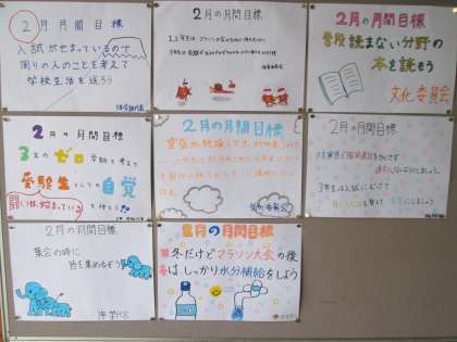 2月に入り、玄関にそれぞれの委員会の2月目標が掲示されました。