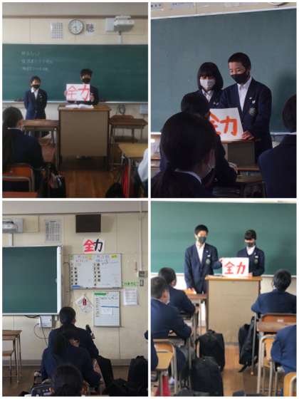 毎週金曜日は体育館に集まって学年集会を行いますが、コロナウイルス感染拡大防止の観点から、なかなか全体で集まることができません。そんな中、学級代表から、残りの1年生の過ごし方について『全力』をテーマに各クラスで話しがありました。