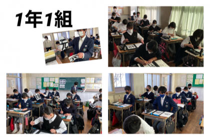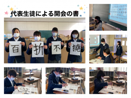 各クラスの代表生徒が学習室で「開会の書」を書いている様子を各クラスに配信し、一斉に書初めをスタート。真剣な様子で思い思いの文字を書いていました。