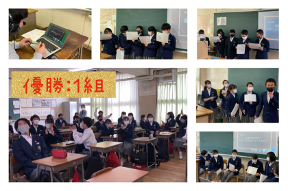 例年この時期は百人一首大会が予定されていますが、現在大阪には緊急事態宣言が発出されているため百人一首の練習も大会もできないので、今日の5・6時間目はTeamsを利用してクラス対抗のクイズ大会を行いました。