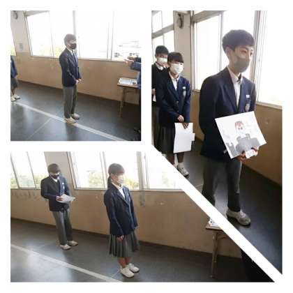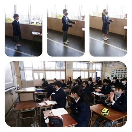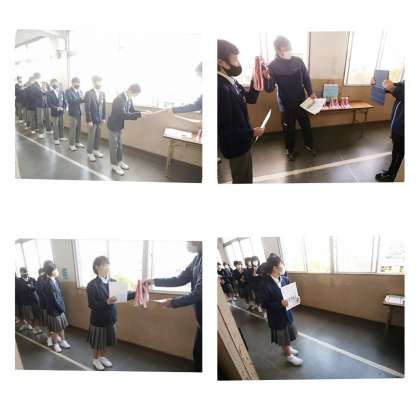 表彰される生徒は廊下に出てきて、教室の皆に見守れながら賞状や盾を受け取っていました。