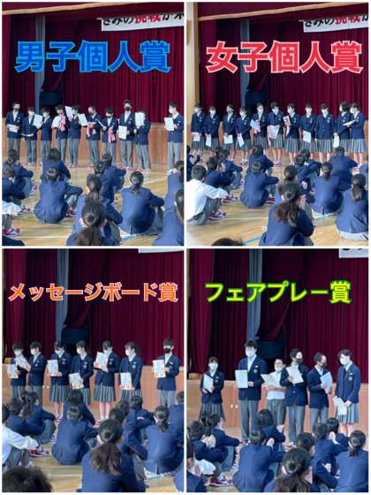 1位〜10位に入賞した男女それぞれ10名には、個人賞の表彰がありました。そして、応援メッセージボードの表彰として、最優秀賞1名、優秀賞6名に、賞状の授与がありました。また、フェアプレー賞として、8名が表彰されました。フェアプレーの受賞内容は、「お腹が痛いなか、よく頑張った。」「みんなをすごく応援していて、走り終わった人にお疲れさまとずっと声をかけていた。」「1位でとてもかっこよかった。すごい頑張っていた。走り終わったあとに、皆を励ましててすごいと思った。」「とてもでかい声で応援してくれた。」などでした。