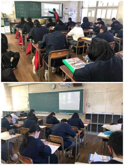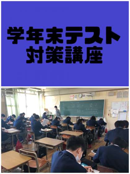 先週の水曜日の6時間目と、今日の1時間目の2時間を使って、テスト対策講座を行いました。教科は、国語・社会・数学・理科・英語の5教科です。事前に、講座を受けたい教科のアンケートをとり、なるべく第一希望が通るように振り分けられています。どの教科もしっかり対策がとられていて、有意義な時間となりました。