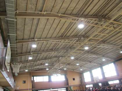 皆さん、おはようございます。久しぶり全員生徒揃っての全校集会です。そして、2か月ぶりの体育館。天井を見上げてください。古い蛍光灯の照明が無くなって、明るいLEDの照明に変わりました。