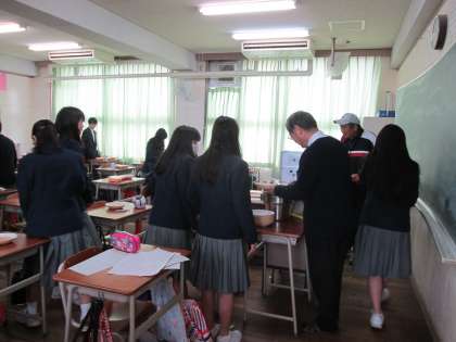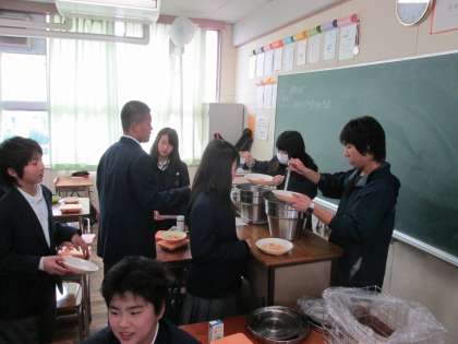 1年の教室では、担任の先生方や、係りの生徒がシチューをお皿に盛りつけています。