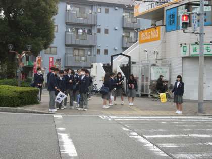 今朝も生徒会役員諸君が交通安全の旗を持って、頑張ってくれています。