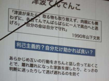 東日本大震災の津波を教訓に、「てんでんこ」や「釜石の奇跡」についても触れられました。