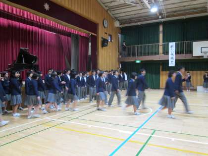 フィナーレ。生徒会長今井君の閉会宣言で幕を閉じ、3年生が順番に体育館を後にします。