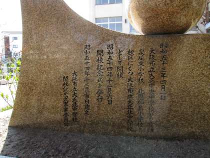 後ろに回って見てみると、「昭和53年4月 大阪市立大正中央中学校から分離 泉尾東小学校、北恩加島小学校を校区にもつ大阪市立大正北中学校として開校 昭和54年12月6日 開校記念式を挙行 昭和54年12月吉日建立 大阪市立大正北中学校 開校記念式事業委員会」と刻まれています。