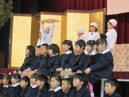 2年生の歓迎のことば。校歌の紹介や、登校や授業、給食など、工夫されたパフォーマンスが始まりました。