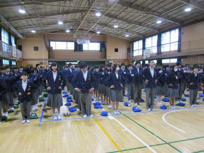 生徒会長号令のもと、朝のあいさつの後、始業式が進行しました。
