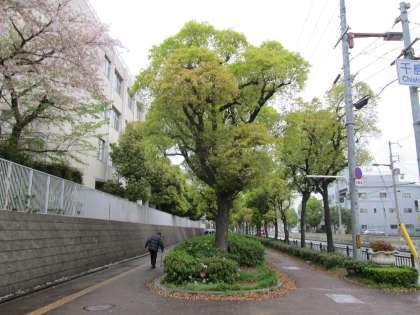 街路樹のくすのきも、派手なサクラに隠れていますが、古い葉が落ちて、若葉に代わりました。保護司様に聞くと、このくすのきは学校とほぼ同じ年齢だそうで。まだまだ大きくなりそうです。