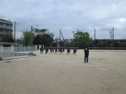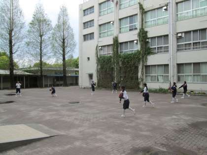 テニスコートではソフトテニス部が、中庭ではソフトボール部が汗を流して練習しています。新しい顧問の先生も、熱心に指導しています。