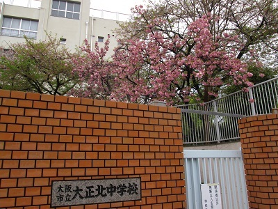 正門の八重桜が、美しく生徒たちを迎えてくれています。