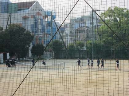 早朝から、ソフトテニス部がランニングでかけ声をあげています。
