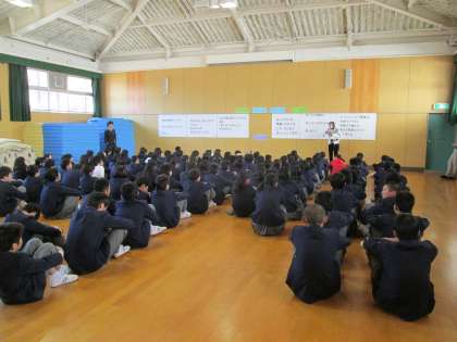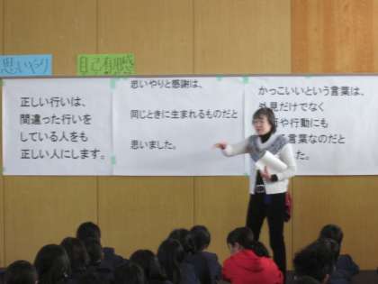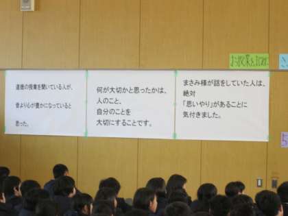 5時間目、2年では、昨年度1年間の道徳集会のまとめについて、ここから生まれた生徒たちの名言や感想文が紹介され、コレスキーや自己有用感がさらに高まりました。