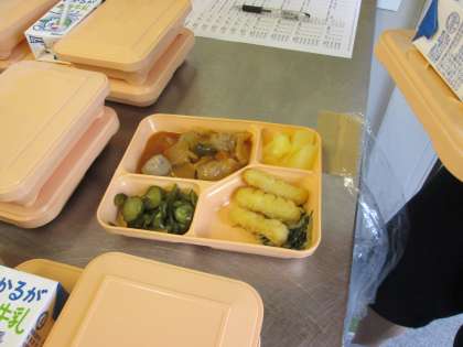 本日のメニューは「肉だんごの甘酢」「イカフライ」。見た目は良さそうです。