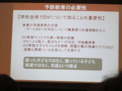 子どもたちのSOSやサインを見逃さないとともに、学校も意識して暴力・虐待やDVについての理解を深め、家庭・地域との連携を密にし、支え合える信頼づくりを構築しなければならないと強く感じました。