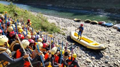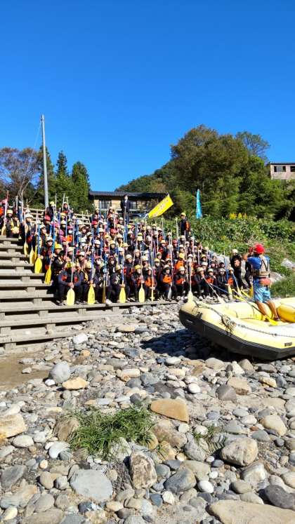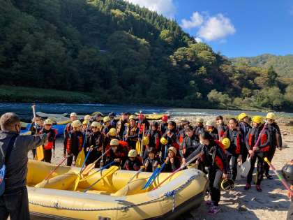 ラフティングを終え、予定より20分早く昼食会場へ移動しています。