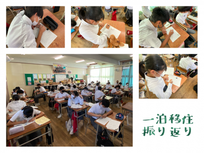 一泊移住の感想を書きながら、「夜〇〇先生がずっと部屋の前の廊下におった!」「あれはウォークラリーじゃなくて崖登りやった」「〇〇が寝言言ってた」などなど、思い出話に花が咲いていました。
