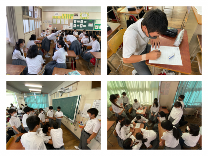 上は一泊移住の感想を書いている様子、下は体育大会の学年種目について話し合っている様子です。