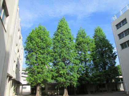 中庭の4本の「メタセコイヤ」。澄んだ青空へ若葉を伸ばしています。