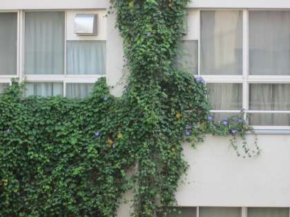 そして、壁面緑化の琉球朝顔が、枯れかかっていたのに、緑が復活し、いくつか開花も。その生命力や恐るべしです。