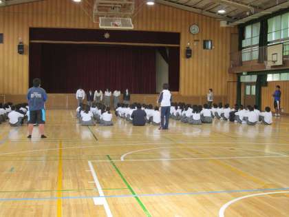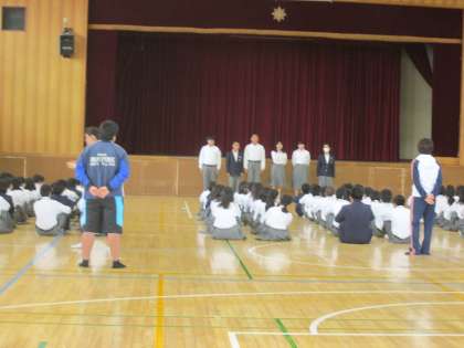 金曜日は1年学年集会の日。今朝は、各クラスの学級代表からの決意表明。そして、授業チャイム着席のための合図出しについて、報告がありました。