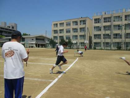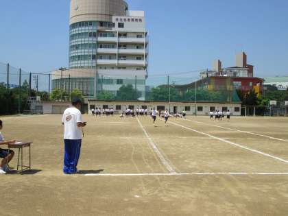 ギラギラ太陽のもと、50m走のタイム測定が行われました。