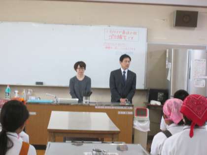 大正北の前校長の赤松先生から、そして、講師の先生から、高校の「パティシエコース」の説明や、デザートづくりや安全面などについて学びました。