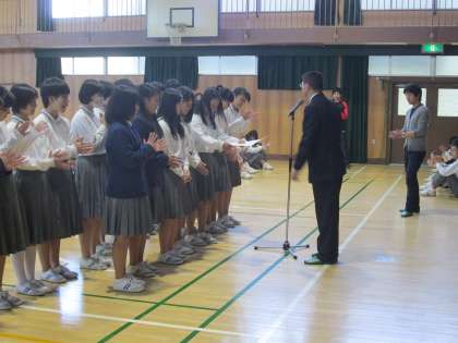 おはようございます。5月初めての全校集会です。先週土曜日は、3年生の土曜授業。高校からの出前授業で、貴重な体験になったと思います。これを自分の進路、今後に生かしてください。