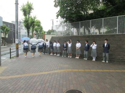 小雨の中、今朝は生徒会役員以外に、学級代表が門の外に出て、大きな声であいさつ。