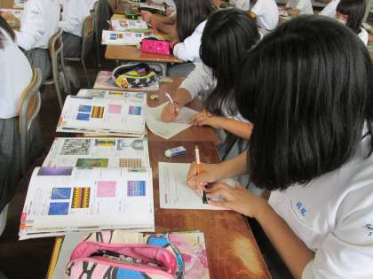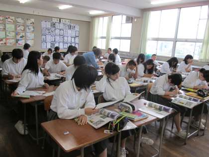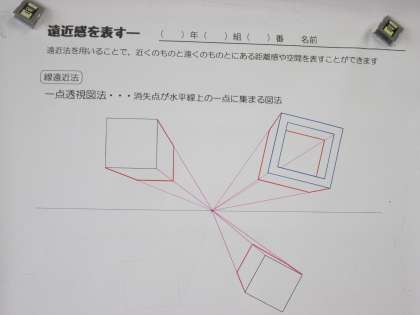まずは、3年生の美術。今日は「一点透視図法」と「二点透視図法」。