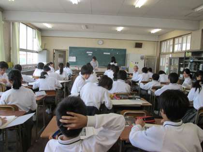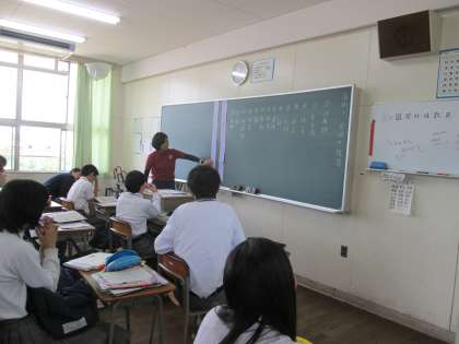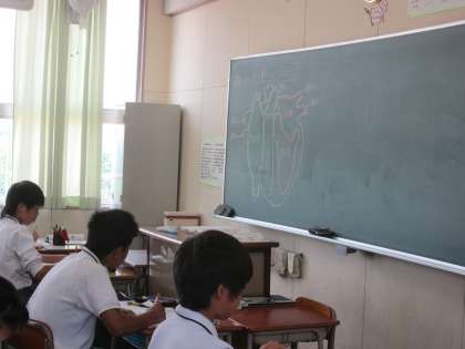 2年理科。黒板いっぱいに、心臓の断面図。大きな部屋が四つ。色分けされてわかりやすいです。