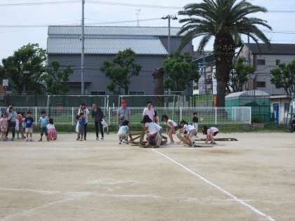 段ボールのキャタピラーをうまく使いこなしていきます。最後は縄跳びでゴールイン!