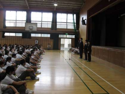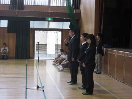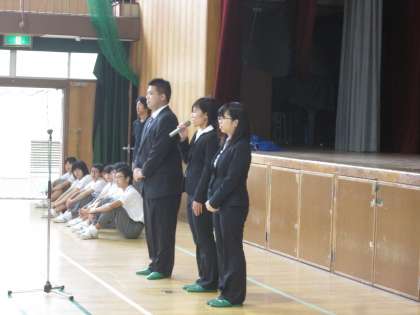 月曜日から1年生が一泊移住に出発するため、本日、全校集会を行いました。