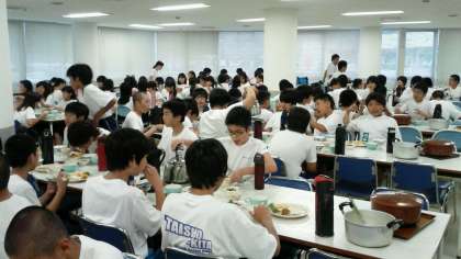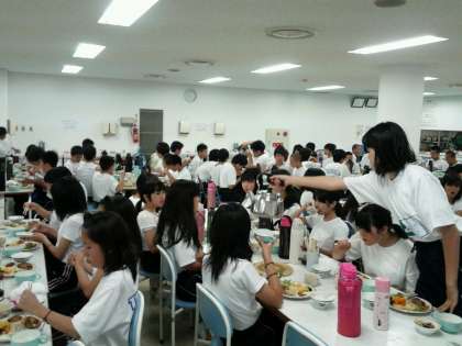 夕食はハンバーグ、クリームシチューなど、美味しくいただきました。子どもたちも、どんどんお代わりしています。