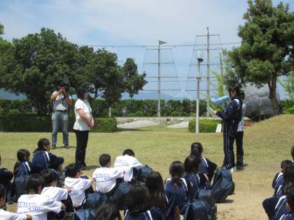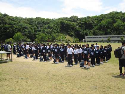マリーンピアに到着し、芝生間の広場で入所式です。