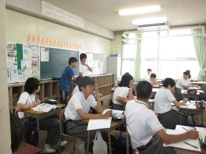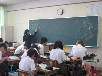 2年の社会。教育実習生の授業。九州の県名と県庁所在地名を確認しています。九州の地図はお上手です。
