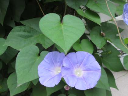 琉球朝顔は、花弁が仲が良いようで、ハート型の葉の下に、二つが寄り添っています。