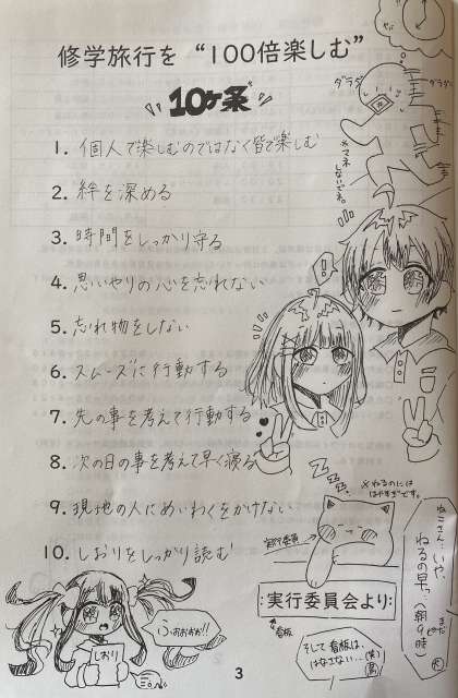 実行委員からは、「修学旅行を100倍楽しむ10カ条」が紹介されました。