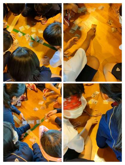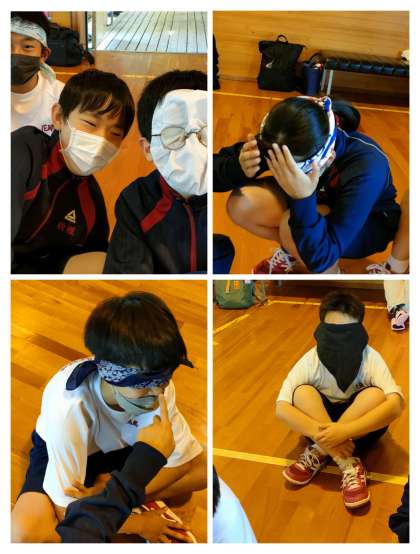 班で3人の人に目隠しをしてパズルをしました。