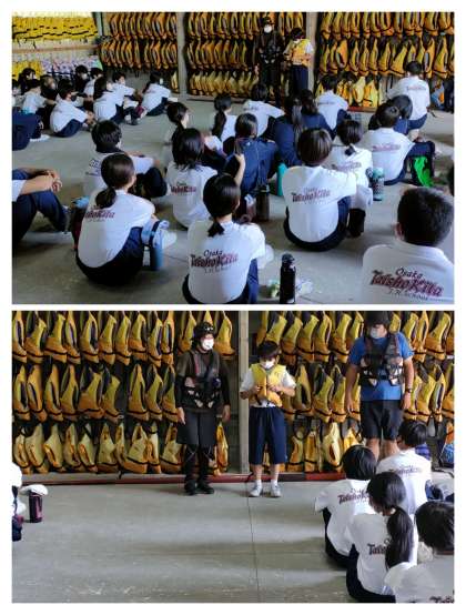 カッター実習に向けてライフジャケットを着用しました。