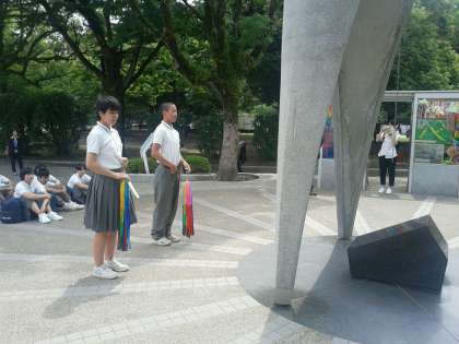 生徒の手による平和セレモニーが行われて、誓いのことば、千羽鶴の奉納、黙とうを捧げました。