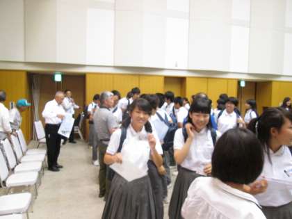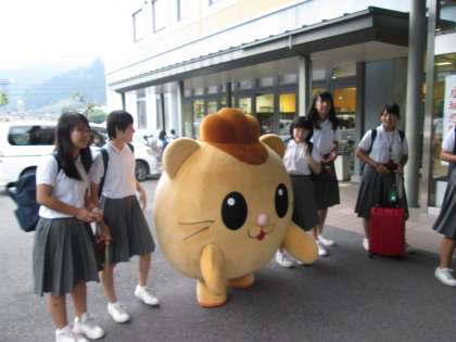 モリミンは昨年の文化祭で紹介されましたが、安芸太田町のイメージキャラクター、可愛いゆるキャラです。このサプライズに生徒たちは大喜び。すぐに、記念写真大会が始まりました。生徒以上に興奮気味の先生もいましたね。