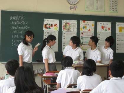 お弁当の名称、誰を対象にした弁当か、アピールポイント、栄養のバランスなど、役割分担して発表してくれました。