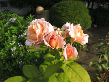 玄関では、ピンクのバラが復活してきました。