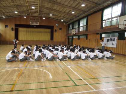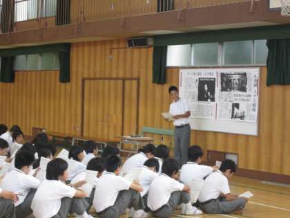木曜日は学年集会の日。今朝は、名言の「神着」と、戦争についてのお話がありました。