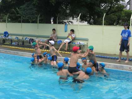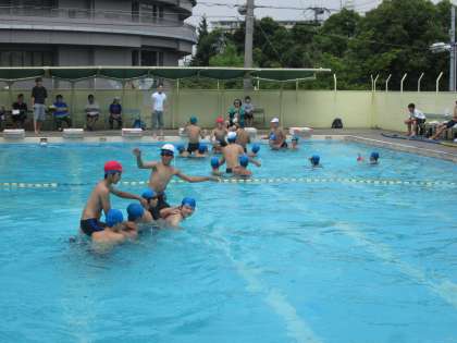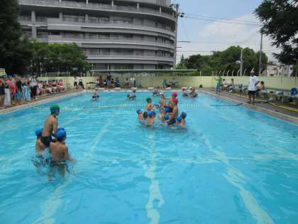 各学級3つの騎馬を作り、プールを2つに分けて、クラス対抗で戦いを行います。